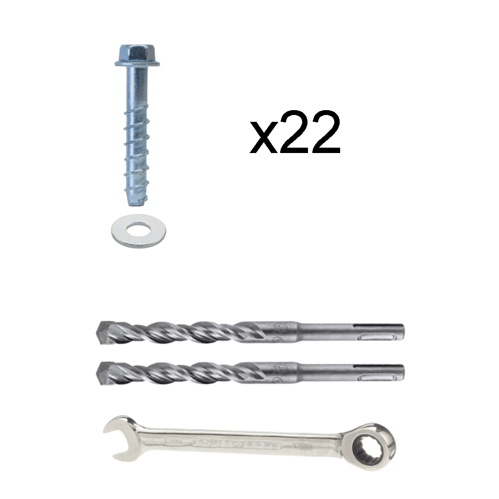 Kit Includes a ratcheting wrench for mounting panels, 22 concrete lag bolts, 44 washers and 2 concrete drill bits for mounting frames up to 11 frames to almost any concrete surface. Perfect for mounting to pre-existing concrete pads/patios (on-site engineering may be required by county) or newly poured concrete slabs/footings.