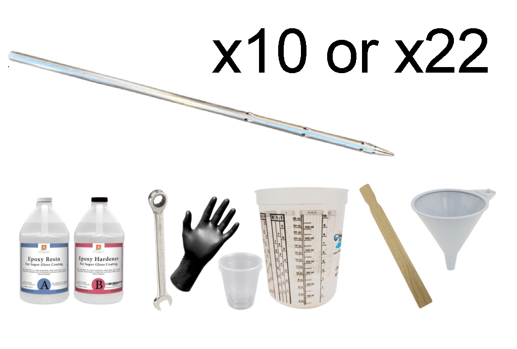 AnchorSpikes kit for mounting BallastRack frames into the ground. With this installation method each BallastRack frame clamps to two AnchorSpikes with a two part epoxy to create a strong anchor. Kit includes a ratcheting wrench, IR AnchorSpikes and a two part epoxy kit to mount multiple frames almost anywhere. Available with sets of 10 or 22 AnchorSpikes.