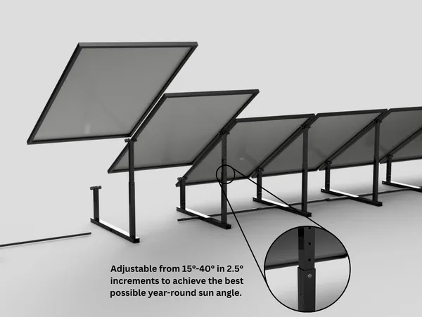 The key feature of the IR-40FSAA is that it offers the ability to set your panels within 2° of the ideal year-round sun angle at an affordable cost and throughout most of the continental United States. With the simple adjustable leg design each frame can be set to the desired angle in just seconds before mounting your panels.