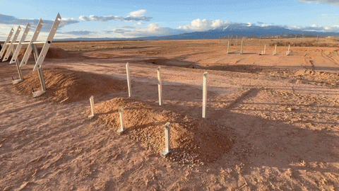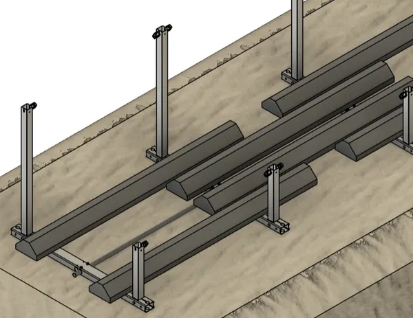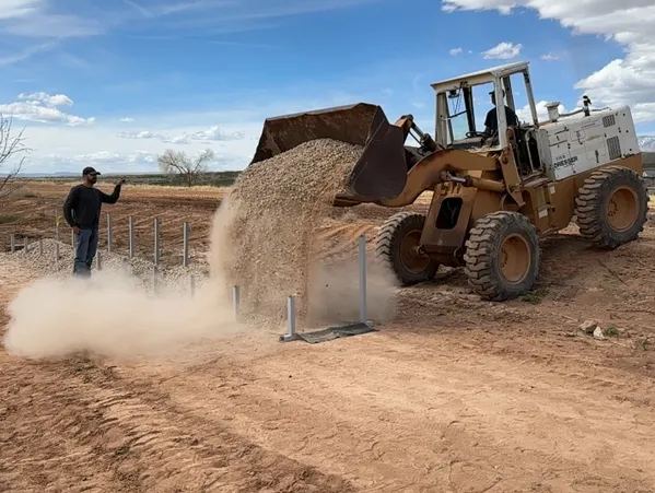 Our EarthBallast mounting option is ideal for most terrain types, particularly when excess soil or crushed rock is available on-site. A skid-steer loader or tractor can be used to evenly distribute earth fill over the included geotextile material that is stretched across and epoxied to the top of each solar rack frame prior to the solar panels being installed, creating a strong heavy ballast with a clean and natural look when completed.