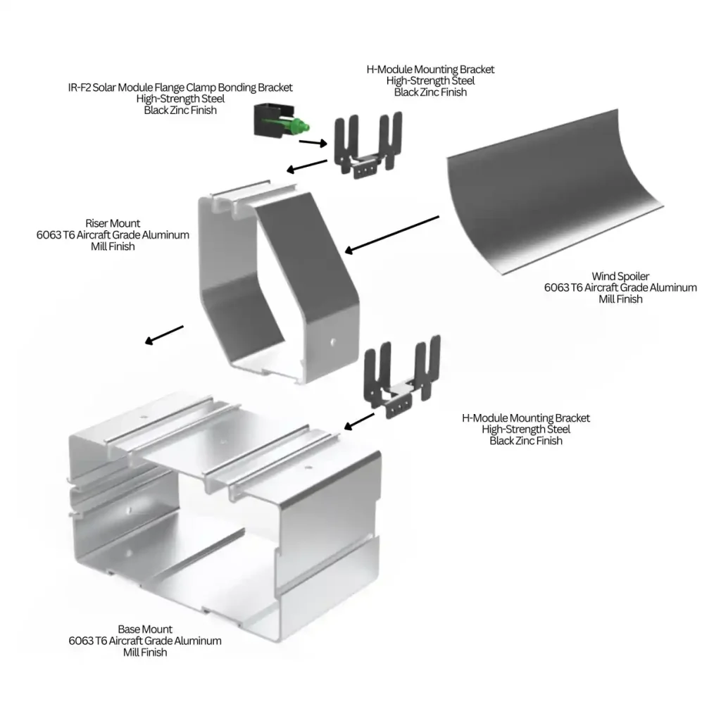 8° universal ballasted mount for roof and ground mounting, designed to rack any size solar module using a standard cinder block for ballast. One kit will be needed per solar panel, plus two additional bases to start each row, each kit includes four IR-F2 solar module bonding clamps. One Wind Spoiler is required for each solar module (sold separately).